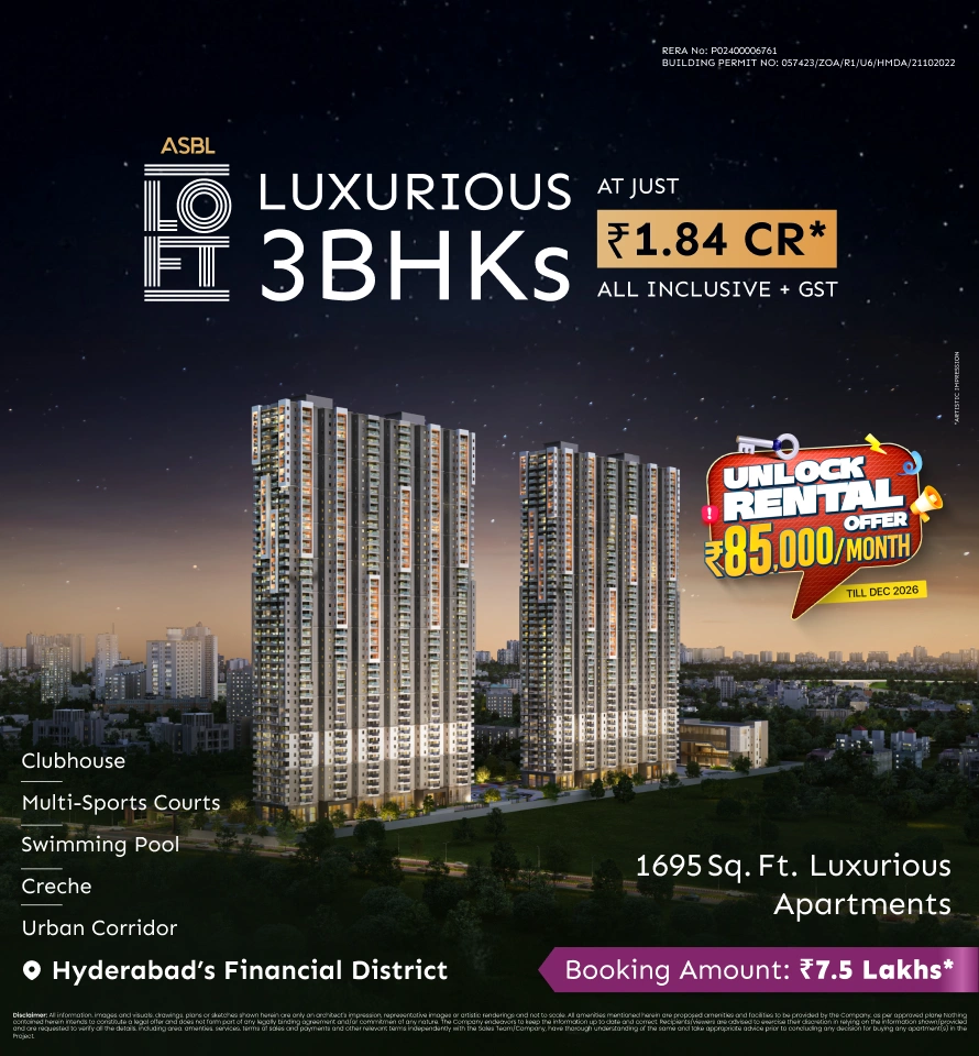 ASBL Loft rises in Hyderabad’s Financial District with 3 BHK homes that stretch wide, soar higher, and open to generous balconies. Priced at ₹1.84 Cr with assured rentals of ₹85,000 a month, and handover in December 2026, it’s as much an investment as it is a lifestyle.